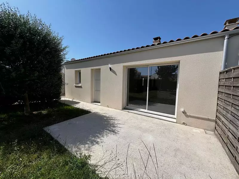 Dans un lotissement calme, cette maison de plain-pied aux normes RT 2012 comprend : Une pièce de vie avec cuisine aménagée et équipée ainsi qu'un poêle à bois, 3 chambres, une salle d'eau, un w.c.