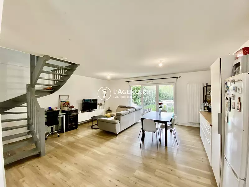 Au rez-de-chaussée, une lumineuse pièce de vie avec cuisine aménagée et équipée s'ouvre sur une agréable terrasse et un jardin privatif, parfait pour profiter des beaux jours.