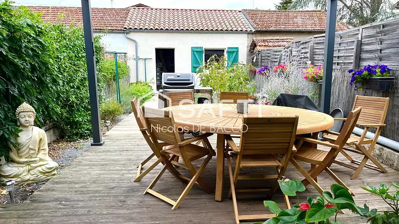 À l'extérieur, la propriété dispose d'une terrasse et d'une véranda offrant des espaces de détente en plein air, ainsi qu'un jardin pour profiter de moments de convivialité en extérieur. Un garage est également présent pour le stationnement.