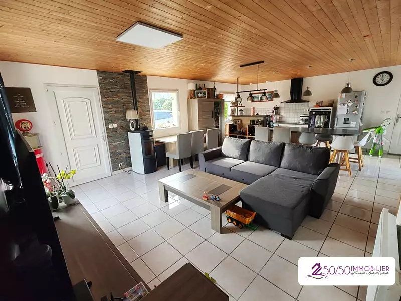 Nous rentrons dans la maison par la grande pièce de vie qui permet de recevoir sa famille et ses amis. Cette pièce est chauffée par un poêle à granulé de 2020 et dispose d'un coin cuisine équipée et aménagée, d'un espace salle à manger.