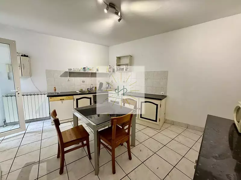 Une partie composée d'une cuisine, d'un salon, d'une salle à manger ainsi que de 2 grandes chambres et une salle de bain.