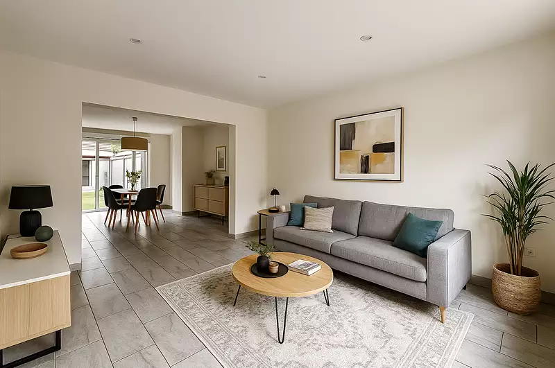 Le rez-de-chaussée dispose d’une entrée avec dressing d’un double séjour lumineux d’une cuisine équipée ainsi que d'une salle d’eau, d’un WC séparé et d’un accès direct au jardin de 80 m2