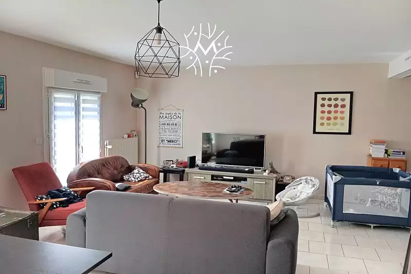 Au premier étage, une entrée donnant sur une vaste pièce de vie lumineuse, une cuisine semi-ouverte et équipée, un salon avec une baie vitrée offrant un accès à la terrasse et au jardin.