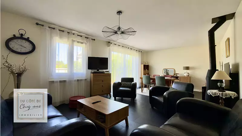 Elle s’ouvre sur un sas puis une entrée indépendante menant à un lumineux salon-séjour de près de 30 m2, réchauffé par un poêle à granulés qui apporte une atmosphère conviviale. La cuisine, séparée, aménagée et équipée, offre un espace fonctionnel et parfaitement organisé.