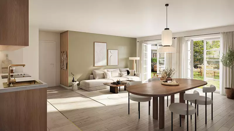 | Cuisine ouverte, aménagée, équipée | 1 salle d'eau - 1 salle de bain |