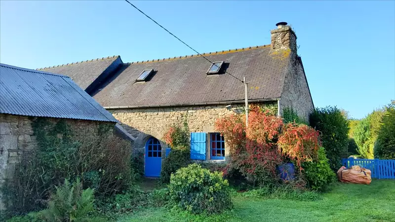 En campagne, dans hameau agréable proche de l'axe Lorient Rsocoff, à 5 minutes du Heulgoat et 10 minutes de Carhaix,Jolie maison en pierres sous ardoises, mitoyenne d'un côté ayant:Séjour / cuisine de 43m² avec cheminée , coin salon de 19m², salle d'eau avec wcA l'étage, deux chambres mansardées en enfiladeDépendance en pierres, jardin attenant