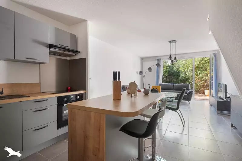 Dans une résidence récente bien tenue, maison de ville T4 en duplex ouverte sur un petit jardin. Au rdc : pièce de vie avec cuisine équipée, cellier et salle d'eau, à l'étage : 3 chambres avec salle de bain. Garage et stationnements invités. Au calme, belles prestations, sans vis-à-vis, tram et commerces à pied.