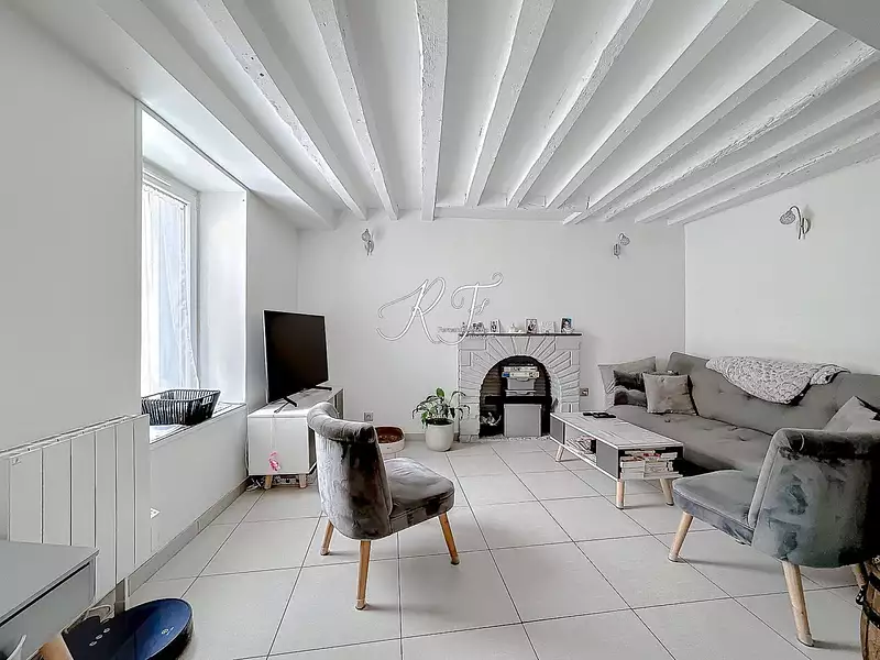Entrée sur une BELLE PIÈCE DE VIE avec cheminée, CUISINE ÉQUIPÉE, espace CELLIER / BUANDERIE.