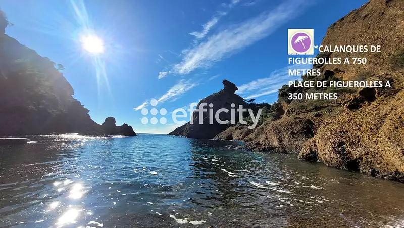 À 750 mètres (10 minutes à pied) de la calanque de Figuerolles et 350 mètres (5 min. à pieds de la plage de Figuerolles)