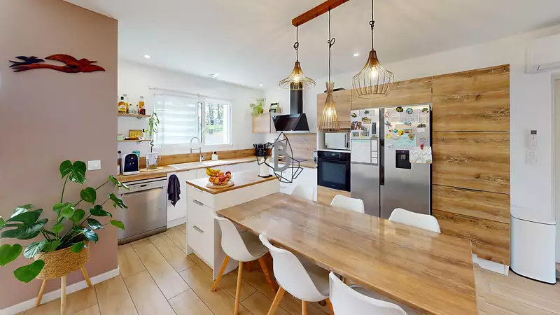 La cuisine ouverte aménagée et équipée avec ilot central allie design et fonctionnalité.