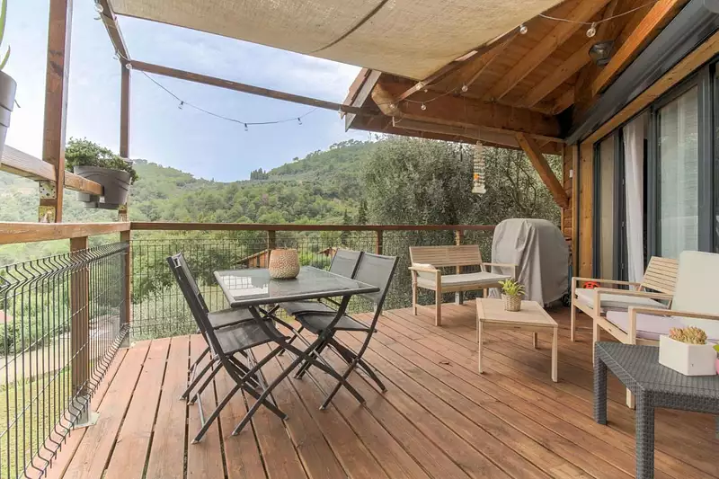 La maison est composée d'une vaste et lumineuse pièce de vie donnant sur une première terrasse. Une cuisine américaine entièrement aménagée et équipée ainsi qu'un W.C indépendant sont sur ce même niveau. Sur les autres niveaux sont répartis trois chambres, une salle de bain avec W.C et une deuxième terrasse attenante aux chambres.