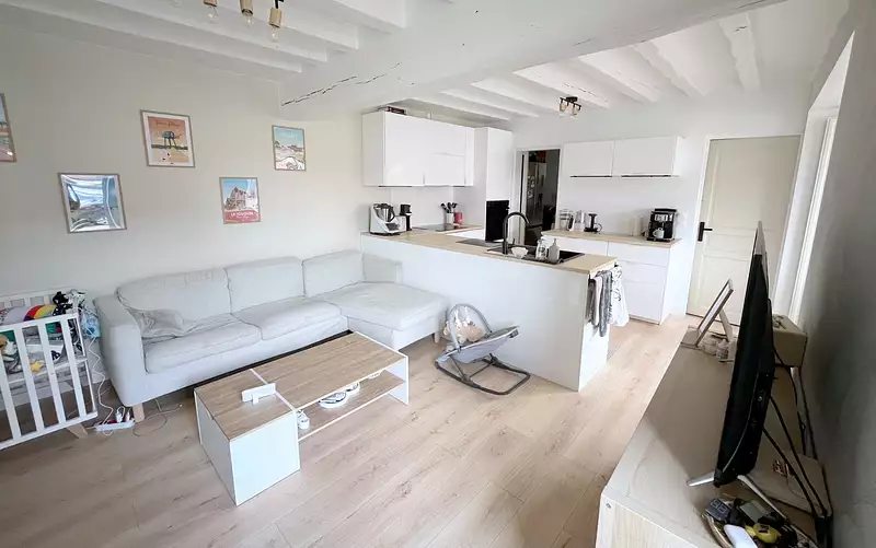 PROCHE COMMODITÉS, Charmante maison en parfait état comprenant entrée sur séjour, cuisine récente aménagée et équipée ouverte, Salle à manger, cellier, Salle de bains avec wc, Chambre avec salle de douche privative ; A l'étage : 2 chambres et 1 bureau.