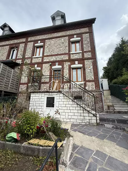 Nouvelle exclusivité VATINE Immobilier ! À Bolbec, proche de toutes commodités, centre-ville à 10 minutes à pied, maison en briques et silex en parfait état, mitoyenne par un côté, sur cave complète, comprenant au rez-de-chaussée : beau séjour/salon, cuisine américaine aménagée et équipée, salle de douche, WC. Au premier étage : un palier dessert deux chambres dont une avec placards. Au second étage : une grande chambre avec de nombreux rangements.