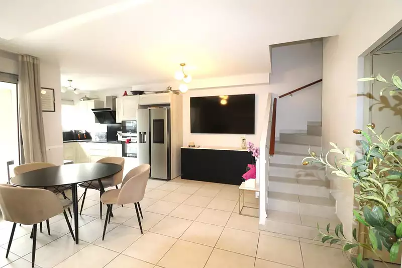 - Au rez-de-chaussée : Une entrée, une salle d'eau, un WC indépendant, un vaste séjour avec une très belle et fonctionnelle cuisine ouverte.