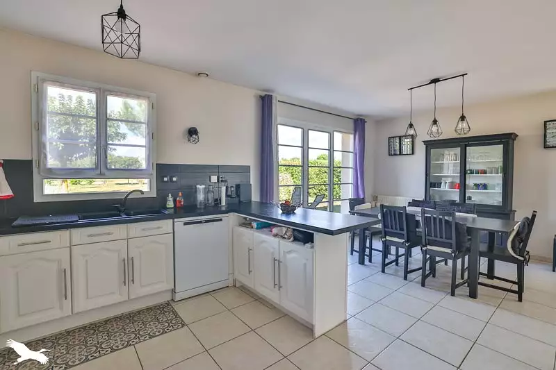 Julienne, proche Jarnac et Cognac,pavillon construit sur une parcelle arborée d'environ 1788 M2 sans vis à vis. Cette maison de plain-pied construite en 2005 offre une entrée, donnant sur un séjour-salon, une cuisine équipée et aménagée, trois chambres, wc, salle de bains, une buanderie, un atelier et un carport. Ecole et bus.