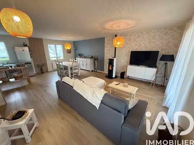 Une entrée spacieuse dessert une pièce de vie lumineuse de 37 m² avec poêle à granulés. La cuisine aménagée, ouverte sur le bel espace de vie cocooning, offre une belle convivialité.