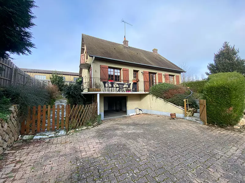 Entre LA FERTE BERNARD et NOGENT LE ROTROU, pavillon 2 chambres Pavillon de 1980, 86m² habitables comprenant : entrée, séjour / salon, cuisine aménagée, dégagement, chambre, bureau, salle d'eau et un wc. A l'étage : chambre, grenier aménageable. Survitrage bois, chauffage central gaz de ville. Sous-sol complet : buanderie, cave et un garage avec porte électrique. Terrain 474 m² clos.