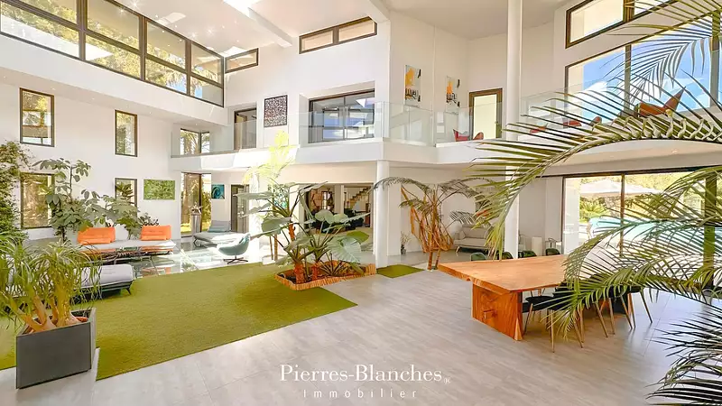 PIERRES-BLANCHES IMMOBILIER - L'EXPRESSION DU LUXE Montpellier - PBI White Stone Le jour se lève dans le quartier résidentiel le plus prisé de l'Est de Montpellier. S'expose alors sous notre regard médusé une villa à l'architecture ahurissante. Inscrite pleinement dans le modernisme, l'utilisation adroite et méthodique de l'espace présente des éléments en blocs accrocheurs, des verreries et du béton blanc entouré de verdure. En découle un ensemble de composants traduisant une palpitation, comme si la structure bougeait, se transformait, se métamorphosait. C'est un défi, une interprétation, une œuvre onirique dans laquelle l'architecte a déposé toutes ses compétences pour réaliser cette construction hors du commun. À présent, levons le voile sur cette somptueuse villa de 875 m² de surfaces habitables édifiée sur un terrain paysagé de 4000 m². Le rez-de-chaussée se présente comme le temple d'un luxe audacieux où la puissance de la nature qui s'érige sous nos yeux est d'une beauté saisissante. Le vestibule nous annonce les pièces majeures par étapes sur plus de 200 m², le tout dans une logique de mise en scène travaillée, favorisant la douceur d'espaces feutrés, faits de points de hauteurs soulignés par l'emploie de couleurs vibrantes et de contrastes saisissants. Véritable ode à l'exotisme, l'espace de réception déploie généreusement ses courbes vers un panorama où la nature s'expose comme le luxe essentiel. La présence stylistique du design intérieur est pointue et se confirme lorsque la cuisine en open space se révèle à nous. Conçue pour sublimer les intérieurs les plus aboutis, une signature italienne comme preuve manifeste. Dans une approche sur mesure qui trouve toute son ampleur dans cette villa où le vertige des volumes a été exécuté dans un travail d'équilibre, nous retrouvons dans le prolongement, une chambre avec une salle d'eau dont l'apparence repose sur un parfait accord entre décoration et intemporalité. Puis nous retrouvons à l'étage la continuité de la sphère privée, composée d'une master suite avec une salle de bains et trois master bedrooms avec salles d'eau. À l'étage inférieur, les options de divertissements sont infinies et comprennent un cinéma privé, un somptueux spa avec cascades et bains à remous. Chers à la gastronomie française, la cave à vin avec l'espace de dégustation attenant ne pourront que combler les exigences des plus fins connaisseurs. Un appartement au confort luxueux avec un accès indépendant vient clore cet ensemble ultime de bien-être. À l'extérieur, exploitant merveilleusement les matériaux translucides et éclatants sous l'effet de la lumière diaphane, la façade en verre nous donne la sensation vertigineuse d'un intérieur et d'un extérieur qui se confondent. La piscine de forme libre recrée l'ambiance paradisiaque et naturelle des lagons tropicaux. Aux reflets opalescents, elle nous expose triomphalement sa taille olympique sur 24 mètres de long. Pour s'alanguir à l'heure de la sieste ou lire sous la chaleur bienfaitrice du soleil, différentes propositions de cosy corners viennent soutenir avec élégance et confort nos intentions. Le Plus : Situé dans un environnement idéal au cœur d'un éden exotique, à quelques battements d'ailes des plages de notre littoral Méditerranéen. La maison peut être proposée meublée. Le choix des matériaux a bénéficié d'une attention particulière où nous pouvons souligner les finitions qui habillent avec précision l'entièreté de la propriété. Technologie Smart Home. Système de sécurité intégral. Droit à construire restant. À proximité du golf, de l'aéroport international et de la gare Sud de France. Proche de l'École Privée Bilingue Internationale. Notre Avis : uvre Sensible ® Une merveille d'harmonie invitant au plaisir esthétique de la pure contemplation. "Une Vision Authentique et Contemporaine de l'Immobilier de Luxe." Franck Ballester ® TOUTE INSPIRATION, MODIFICATION, REPRODUCTION EST INTERDIT - REGISTERED TRADEMARK Dossier sur références Contact +33 (0)4 67 70 07 87