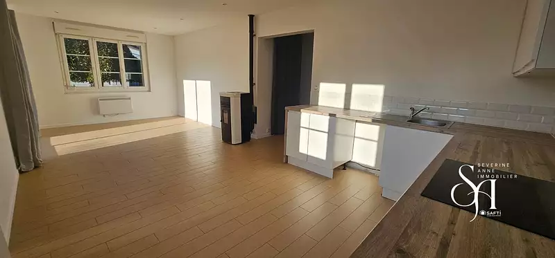 Au RDC d'une entrée, une buanderie, cuisine aménagée ouverte sur séjour avec poêle à granulé ramoné en 2025 et accès à une terrasse exposée sud, une chambre, salle d'eau avec wc, une grande cage d'escalier pouvant accueillir un bureau.