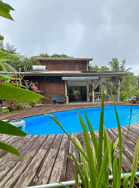 L'accès à la maison se fait par une terrasse couverte de 20 m2 avec vue sur la pisicne de 7 x 3 et le jardin joliement arboré (nombreux arbres fruitié : manguier, avocatier, goyavier, bananier,...).