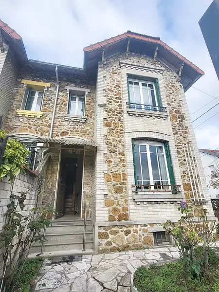 Charmante maison meulière et brique de 87 m2 habitable comprenant au rez-de-chaussée surélevé : entrée, séjour avec cheminée, cuisine, salon donnnant sur véranda de 20 m2, WC.