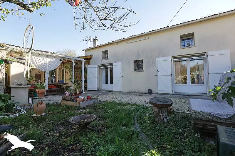 Maison au calme. Le rdc se compose d'une pièce de vie lumineuse équipée d'un poêle à bois, une cuisine aménagée avec un cellier, une chambre, une salle d'eau, et toilettes. L'étage offre une seconde chambre ainsi qu'un espace polyvalent pouvant servir de dressing ou de bureau. Vous trouverez un jardin d'environ 270 m², et un garage