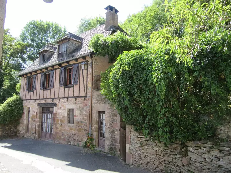 Située dans le très beau village médiéval de Conques, maison de caractère en pierre et colombage datant du XVIIII ème siècle. D'une surface habitable de 88 m2 environ, elle se compose : -En rez de chaussée : d'un atelier de 29,31 m2 environ, d'une pièce et d'un réduit -A l'étage, ouvrant sur une très belle terrasse ombragée : d'un séjour de 28,22 m2 environ avec coin cuisine équipée et poêle à bois, d'une chambre et d'une salle de bains avec WC -Au-dessus : de deux chambres et de WC séparés. Construction en pierre et colombage, charpente traditionnelle, couverture en lauze, chauffage électrique et poêle à bois, isolation murale, assainissement collectif. Le tout avec un beau terrain attenant et arboré de 1082 m2. Aucun travaux ne sont à prévoir, possibilité garage en rez de chaussée, stationnement possible. Bien rare dans Conques, pour plus de renseignements nous contacter !