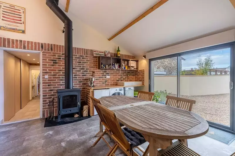 Dès l’entrée, vous serez séduit par une pièce de vie spacieuse de 36,54 m², baignée de lumière grâce à son exposition Sud, et dotée d’un poêle à bois qui confère à l’ensemble une atmosphère chaleureuse.