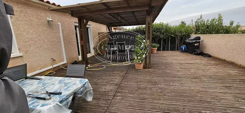 Le grand espace extérieur, avec sa terrasse en bois, est parfait pour des repas en plein air ou des moments de détente sous le soleil. Cette propriété est une opportunité exceptionnelle pour ceux qui cherchent un investissement sûr et confortable dans le sud de la France.
