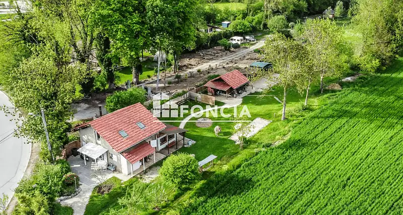 MASSONGY, charmante maison individuelle pleine de charme qui se compose au rez de chaussée d'une agréable pièce à vivre avec cuisine, une véranda donnant sur le jardin sans vis à vis et une salle de bains. L'étage se compose de 2 chambres à coucher ainsi qu'une salle de bains. Elle est agencée sur une très belle parcelle de terrain d'environ 3900m2 non constructible, plate et arborée, agrémentée d'un petit chalet et d'un plan d'eau à son extrémité.