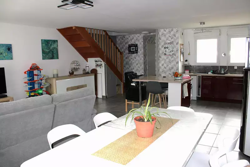 Maison mitoyenne de 2005 à saisir dans quartier calme, située à 15 km au sud-est de Rennes. Composée d'une grande salle de 50m² comprenant une cuisine aménagée, de 3 chambres à l'étage. Surface habitable actuelle de 90 m², avec possibilité de 4è chambre de 15m². Côté pratique : un garage attenant et aménagé d'une partie buanderie et l'autre en atelier, plus stockage en surélévation. Terrain clos de moins de 100m² exposition sud. N'attendez pas pour visiter, c'est une très belle opportunité !