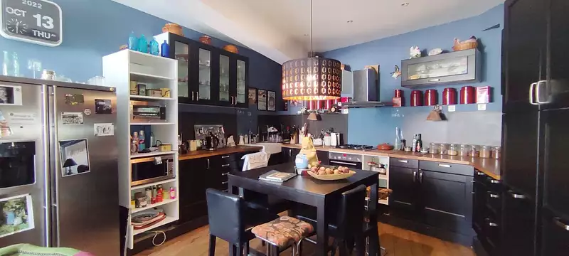Vous serez séduit dès l'entrée par sa pièce de vie chaleureuse et lumineuse, mise en valeur par un spacieux séjour avec poêle à bois, et une cuisine centrale parfaitement équipée, idéale pour recevoir famille et amis.