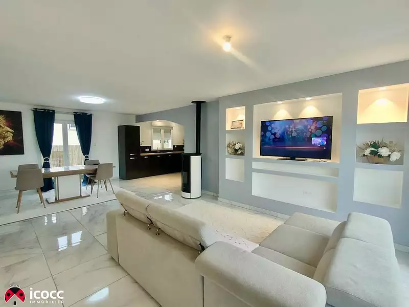 Le salon-séjour lumineux, chauffé par un poêle à granulés, s'ouvre sur une cuisine équipée avec des plaques mixtes (gaz et électricité). Le garage, entièrement carrelé, vient compléter cette maison, offrant un espace supplémentaire fonctionnel.