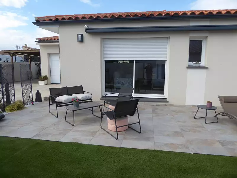HORS LOTISSEMENT, A SAISIR !!!!, au CALME, JOLIE VILLA CONTEMPORAINE T.4 DE PLAIN PIED + GARAGE - de 2023 - Lumineuse - EXCELLENT DPE. Environ 90 m2 habitables . Terrain clos arboré de 332 m2. Séjour/cuisine équipée, 3 chambres avec placards dont une suite parentale, dressing, 2 salles d'eau, 2 wc. Clim. reversible gainée. Possib. rentrer camp.car, DECENNALE et DO - - ETAT NEUF. Vue dégagée Albères.