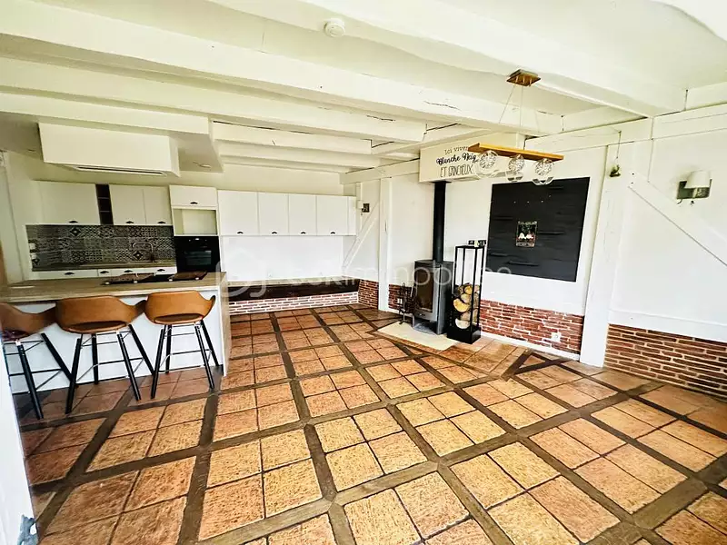 Elle se compose d'un séjour chaleureux équipé d'un poêle à bois, d'une cuisine fonctionnelle aménagée et équipée, un wc indépendant le tout attenant au jardin de 50m2 environ avec un cabanon.
