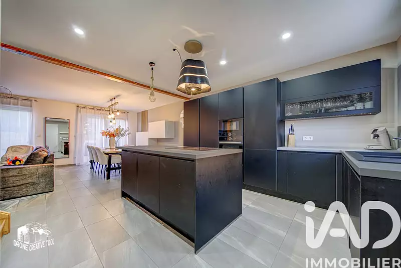 L’entrée s’ouvre sur une pièce de vie lumineuse, composée d’une cuisine équipée contemporaine avec îlot central, ouverte sur un séjour chaleureux.