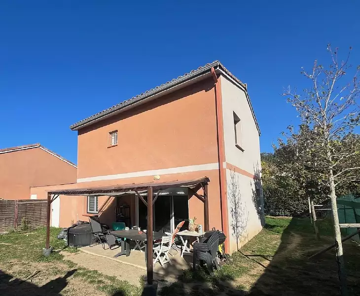 La Salvetat Saint-Gilles, residentiel, belle maison contemporaine T4 de 87,85 m2 avec garage de 22 m2 sur terrain 315 m2. Le hall dentree de 3,95 m2 souvre sur un espace de vie lumineux de 36,90 m2 avec cuisine americaine amenagee avec acces au garage disposant dune porte sectionnelle et dune porte de service. Le sejour ouvre par une baie vitree sur la terrasse. Toilettes. Un escalier mene au degagement de 3,43 m2 de letage qui distribue trois chambres de 12,73 m2 avec placard, 11,25 m2 avec placard et 9,09 m2, la salle de bains de 5,14 m2 avec baignoire et doubles vasques sur meuble ainsi que les toilettes. Menuiseries PVC doubles vitrages, volets roulants, chauffage central par chaudiere gaz a condensation. Maison tres agreable et lumineuse situee dans un quartier residentiel au calme.