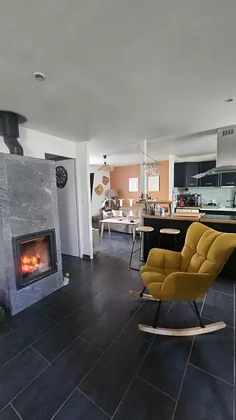 Au rez-de-chaussée, dès l’entrée, vous découvrez une pièce de vie chaleureuse agrémentée d’un poêle à bois, une cuisine aménagée et équipée, ainsi qu’un petit coin salon cosy. Une salle de bains, un WC indépendant et un accès direct au garage complètent ce niveau.