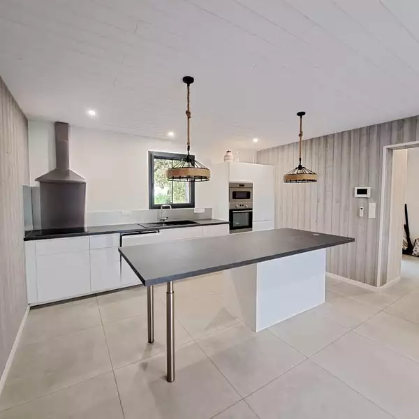 L'espace rez-de-jardin vous propose notamment une entrée lumineuse, buanderie avec pompe à chaleur, et espace pour stocker vos machines, toilettes, un salon séjour avec cuisine aménagée et entièrement équipée (électroménager intégré, îlot central...)