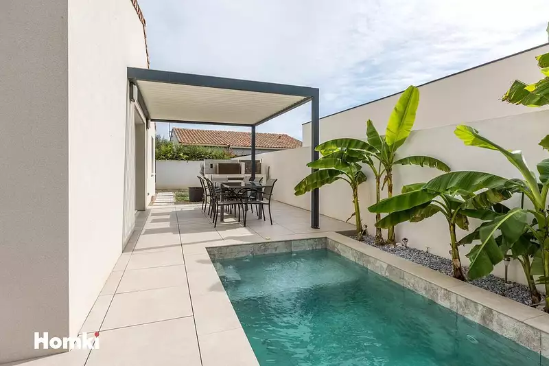 - Piscine et cuisine d'été, entourées de plantes tropicales.