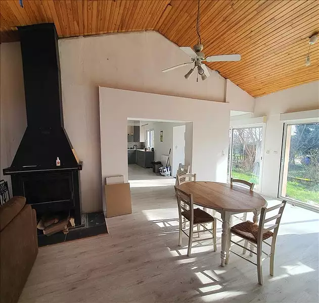 Au calme sur terrain clot et ombragé avec arbres fruitiers et puits, pavillon de plain pied composé de deux chambres, un bureau, une cuisine équipée, salon/salle à manger avec poële central. Grande luminausité avec baies vitrées sur la totalité de la facade Sud.