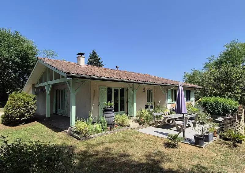 Charmante maison traditionnelle landaise dotée d'une belle et chaleureuse pièce à vivre donnant sur cuisine ouverte, de trois chambres et d'un garage attenant.