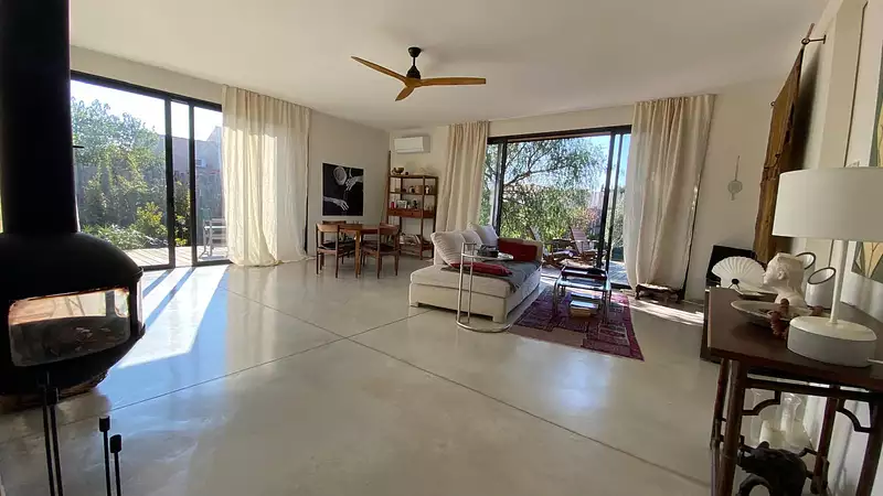 Construite en ossature bois, elle offre un confort thermique exceptionnel été comme hiver, grâce à un poêle Focus suspendu et une climatisation réversible couvrant l’ensemble. L’architecture met en valeur de larges ouvertures protégées par des volets bois coulissants, qui filtrent la lumière et soulignent le caractère contemporain de la villa.