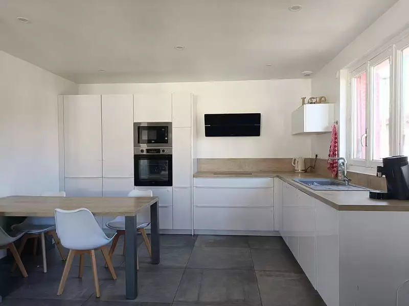 A l'étage on trouve un séjour ouvert sur une cuisine équipée moderne et fonctionnelle, trois chambres, une salle de bain et un WC indépendant.