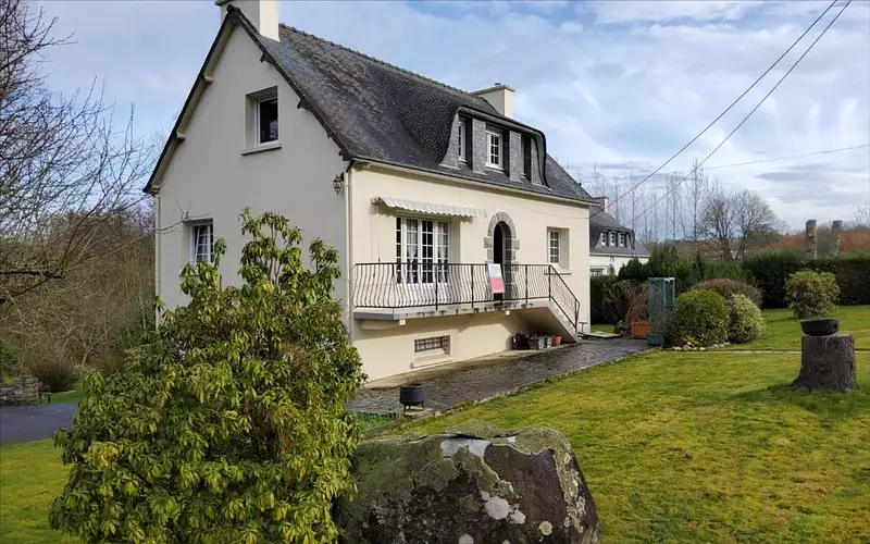 Treffrin, maison traditionnelle bon état comprenant :- Au rez-de-chaussée surélevé : Entrée, cuisine avec éléments, salle avec cheminée (insert), 2 chambres, salle de bains, WC.- A l'étage : 2 chambres, grenier pouvant être aménagé.Cave et garage. Terrain attenant avec abri 2000 m2 et rivière en contrebas. Puits et pompe.