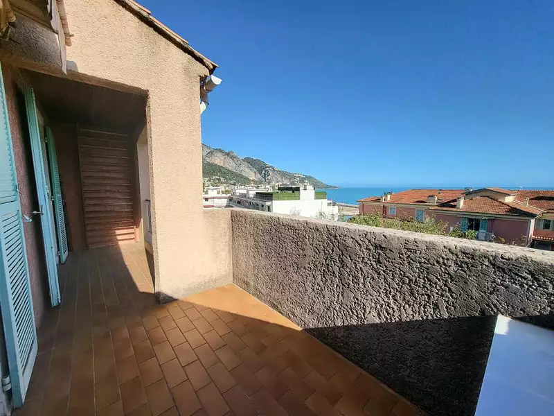 A l'étage, trois chambres avec placards intégrés dont deux donnant sur une terrasse avec vue mer exceptionnelle et vue sur la vieille ville de Menton, une salle de bains avec baignoire et un w.c indépendant.