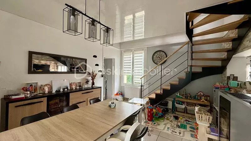 Cette maison est composée d'un salon/séjour lumineux équipé d'un poêle à granulés, de 3 chambres, d'une salle d'eau avec double vasque, d'un WC séparé, d'une cave ainsi que d'un ancien garage aménagé en salle de jeu, modulable selon vos besoins.