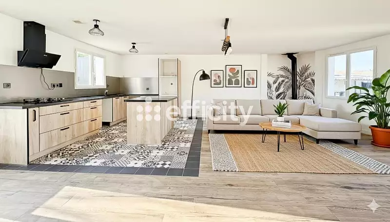 Espace de vie : 40 m² avec salon lumineux, poêle à bois et cuisine ouverte