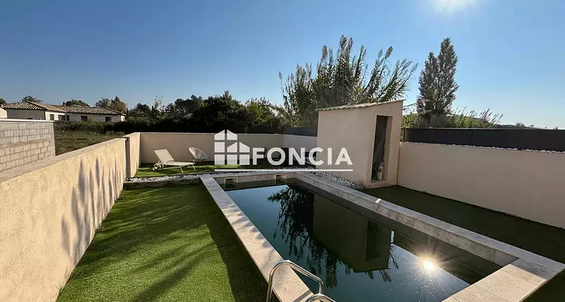 Le séjour lumineux s'ouvre sur une terrasse conviviale prolongée par un jardin paysagé avec piscine, idéal pour profiter des beaux jours.