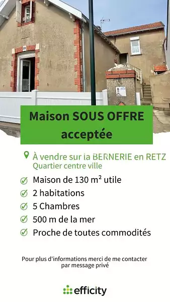 Yohann DENIAUD et Efficity, l'agence qui estime votre bien en ligne, vous propose, cette charmante maison de caractère située en plein cœur du centre-ville de La Bernerie-en-Retz. Cette demeure saura vous séduire par son authenticité et son potentiel.